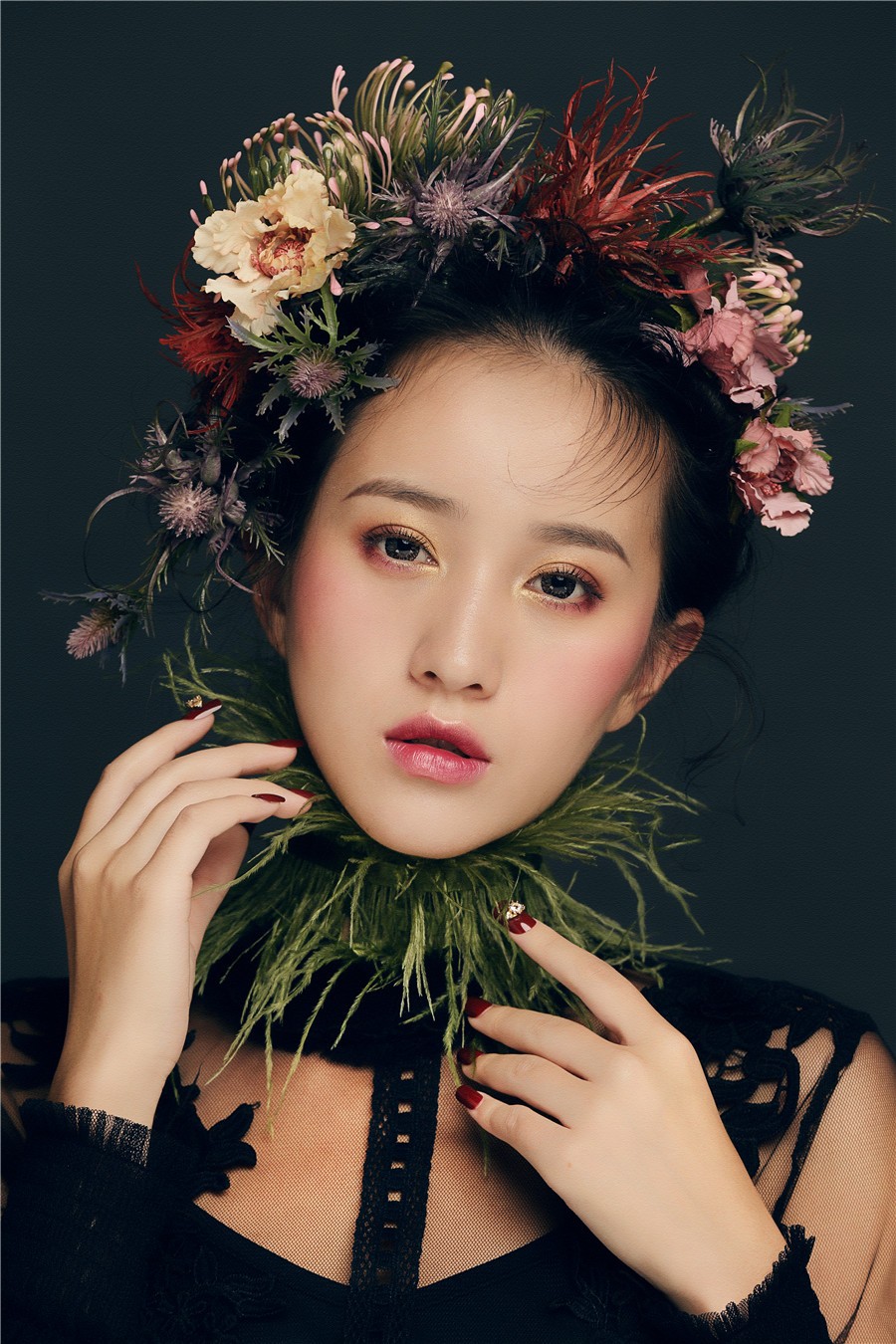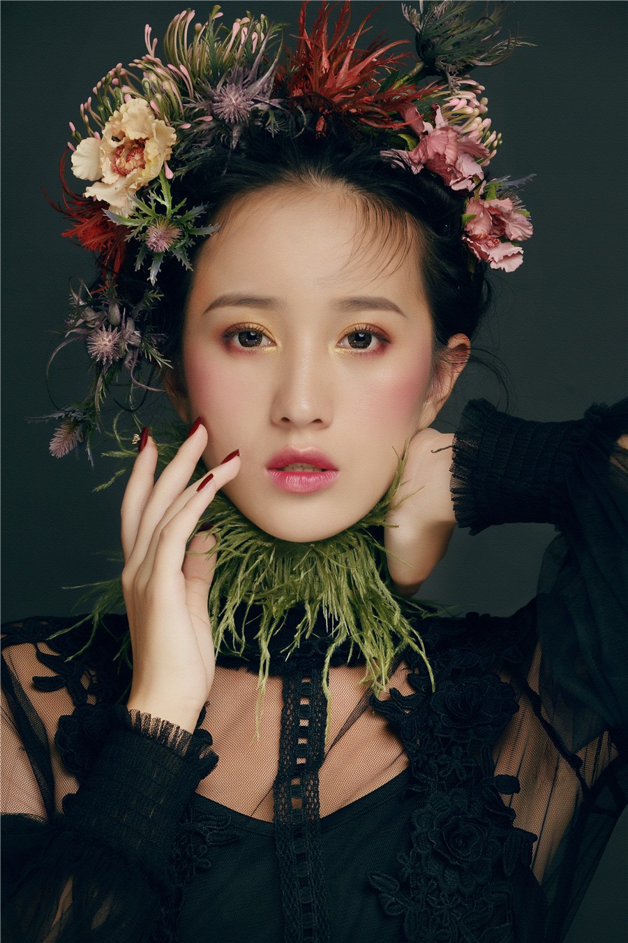 麗竹學(xué)校彩妝作品--復(fù)古油畫風:飽滿濃郁的妝面色彩,配以仙氣十足森系田園風,搭上靈動的發(fā)絲在陽光下跳躍,營造出了一種別樣的浪漫氣氛,宛如華中走出的女子。