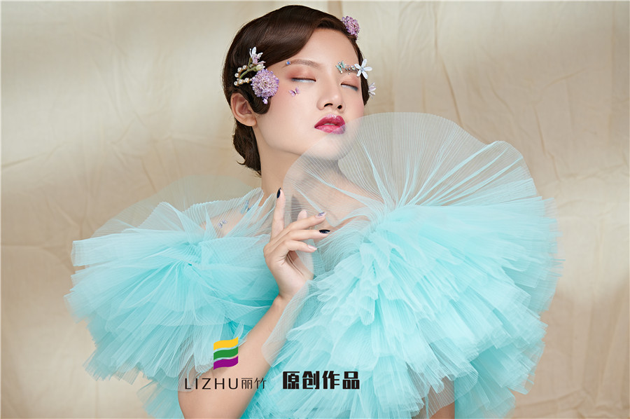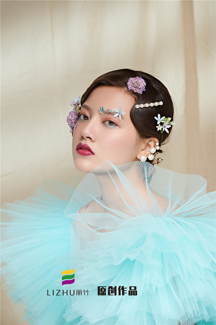 麗竹學(xué)校彩妝作品---氣質(zhì)名媛造型:藍(lán)色輕紗加上妝容花朵點(diǎn)綴,頭飾與發(fā)型的完美搭配,流淌出輕柔舒緩之美,簡約自然的情緒態(tài)度。
