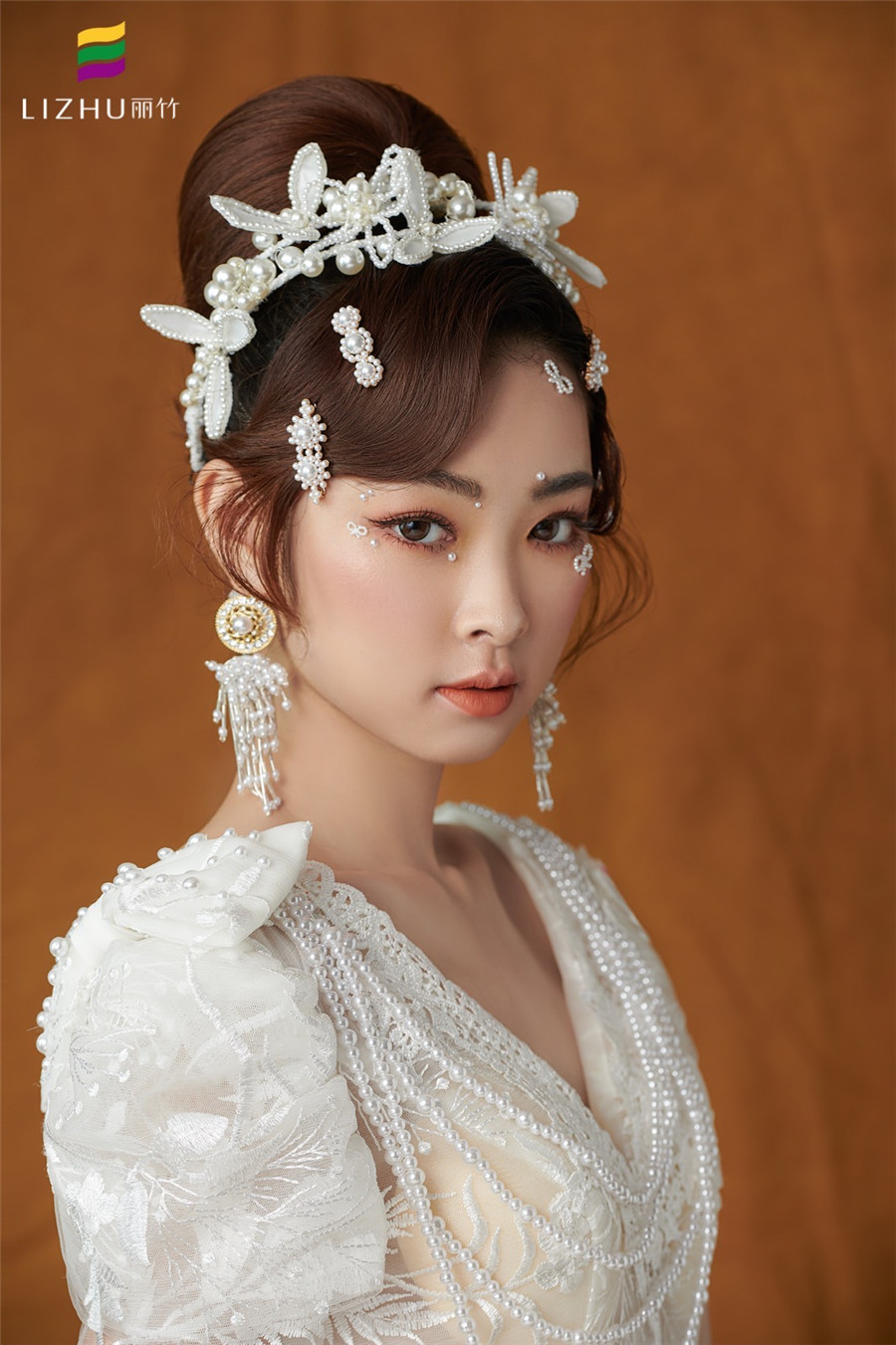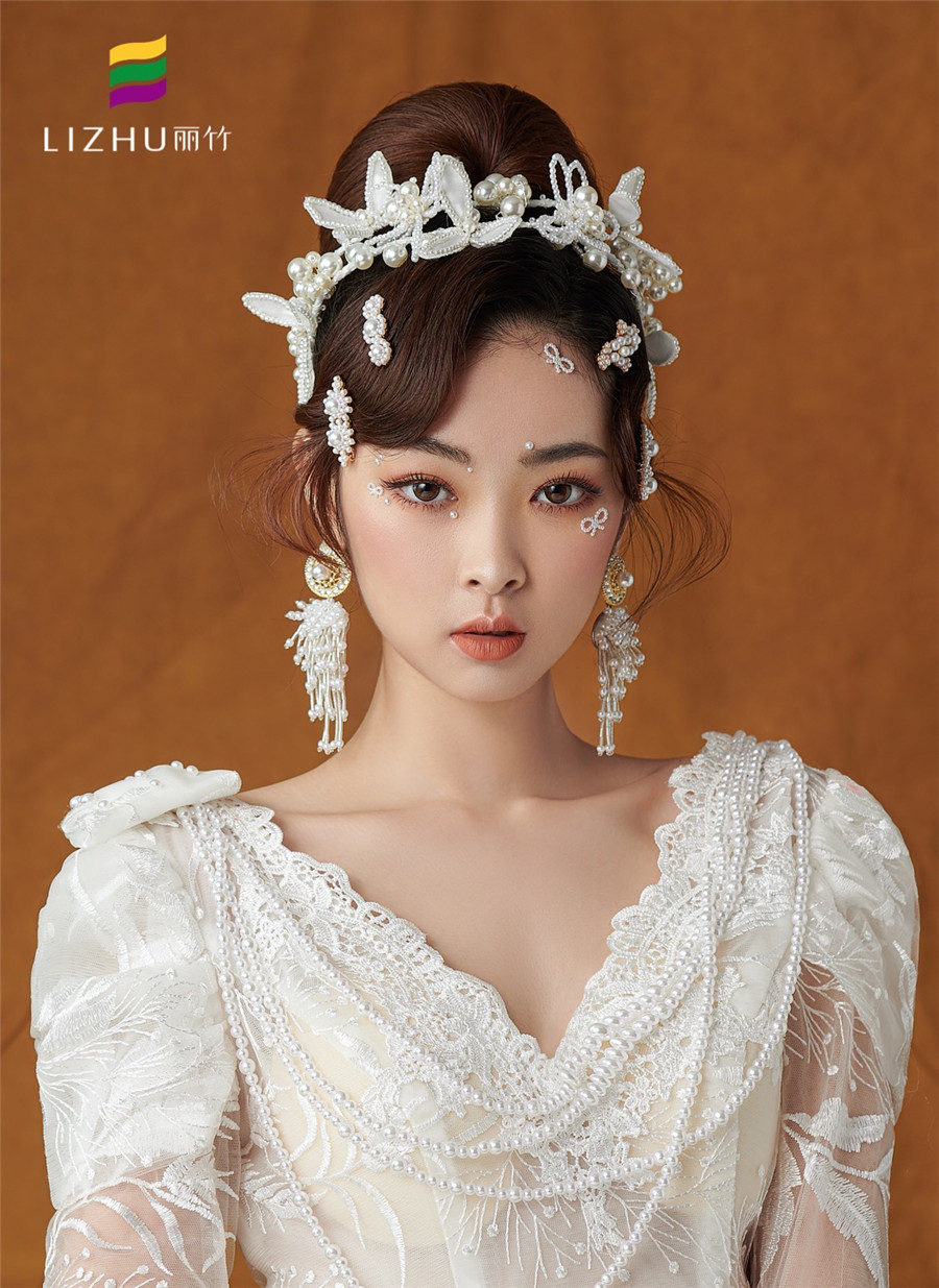 麗竹學(xué)校彩妝作品---輕奢復(fù)古珍珠妝容:復(fù)古簡潔優(yōu)雅的盤發(fā),佩戴少女俏皮的頭飾,純白珍珠搭配的精致,展示出萬種舊日風(fēng)情,使得微微一笑很傾城。
