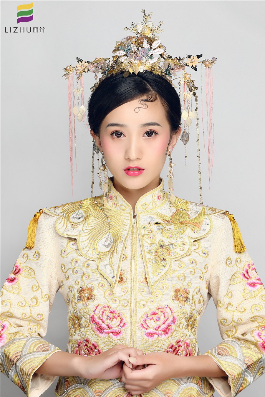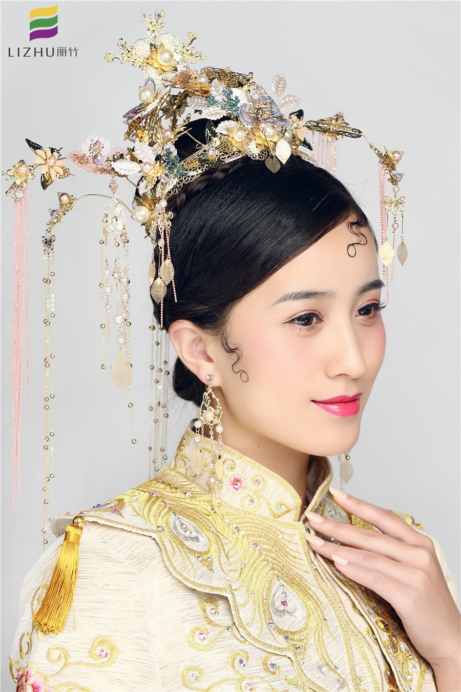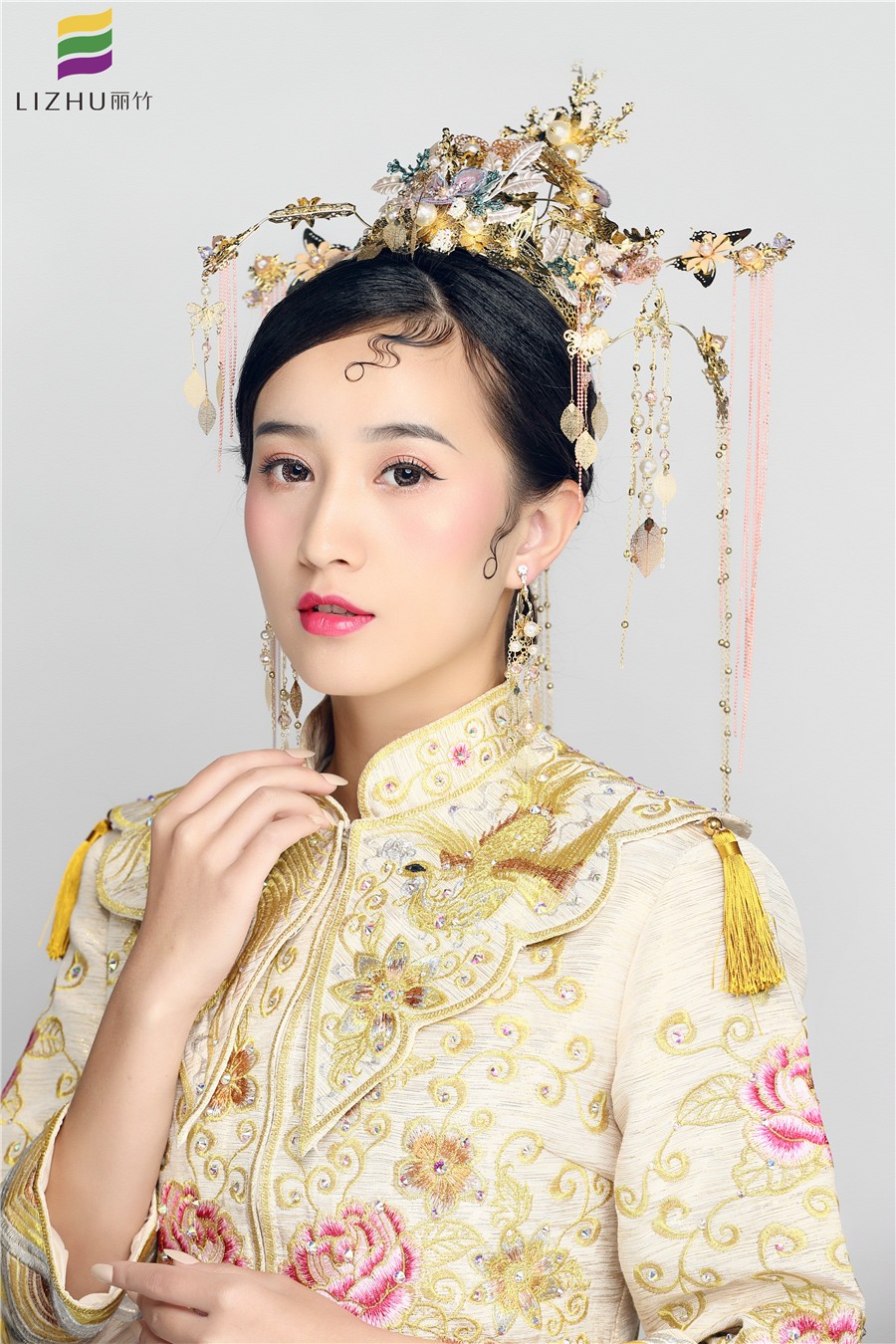 南寧麗竹化妝學校作品---中式復古造型。婉約典雅,配上搖曳的鎏金頭飾,面上略施粉黛, 一抹朱唇紅艷,幾分婉約賢淑,幾分典雅大氣,精致的中式新娘造型!