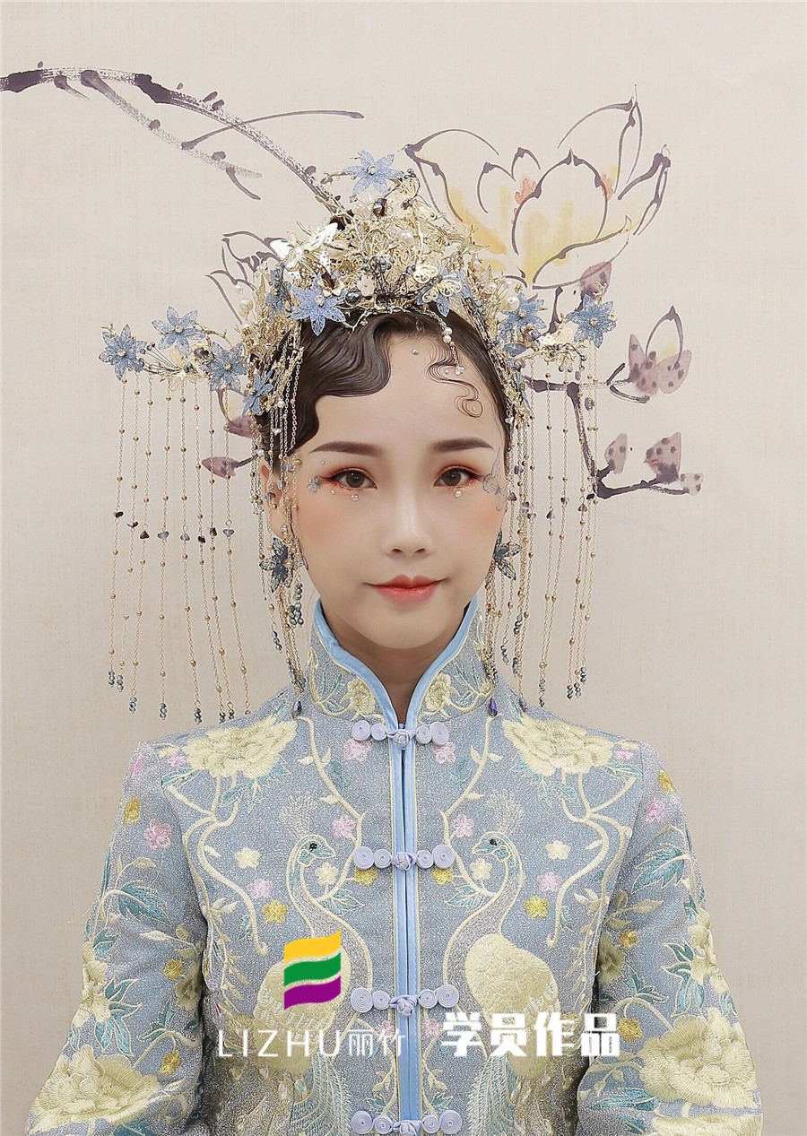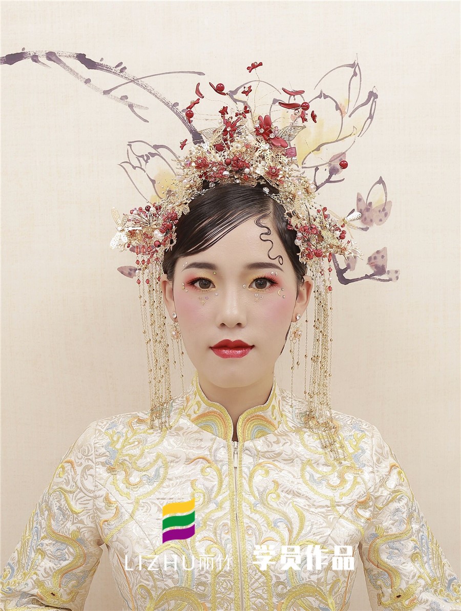南寧化妝學校分享:裊娜少女羞,歲月無憂愁,中式新娘驚艷的一抹刺繡,精致典雅,演繹中國風,優(yōu)雅的盤發(fā)搭配精致的發(fā)飾,一身華服,正是芙蓉不及美人妝。