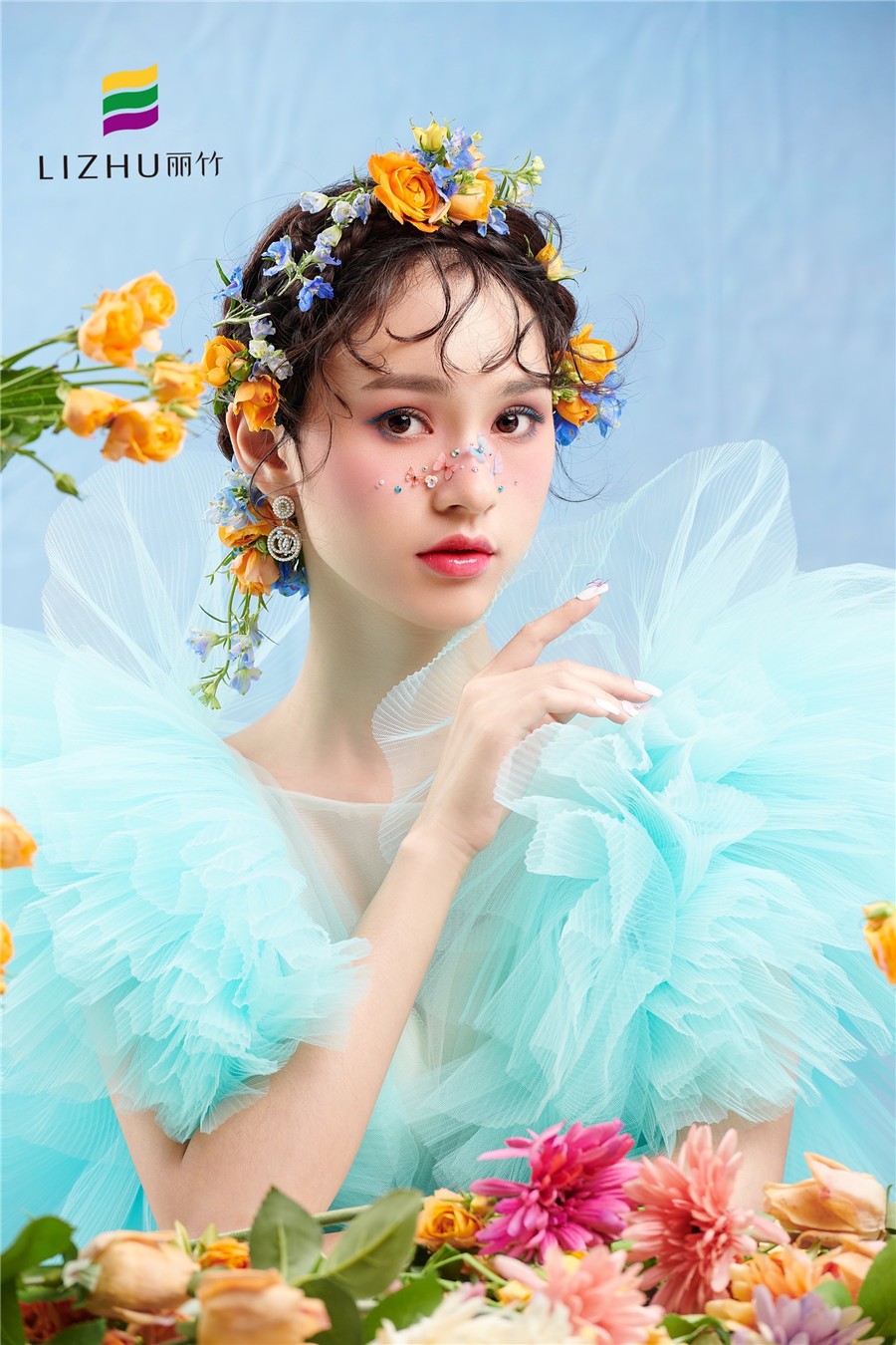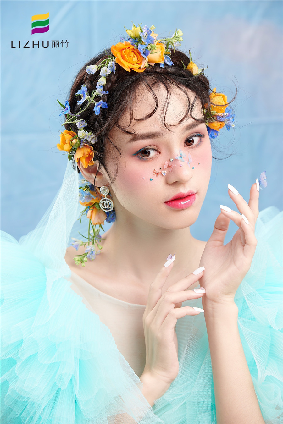 南寧化妝培訓學校作品---減齡鮮花造型:完美碰撞出浪漫少女感,藍色眼線與紗裙的絕美搭配,捕獲清新浪漫的夏日芬芳,空氣中滿是花漾沁襲的甜蜜感 。