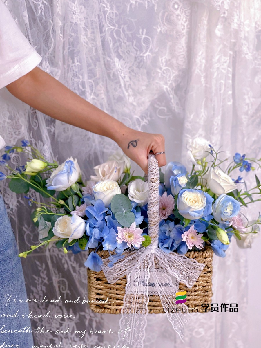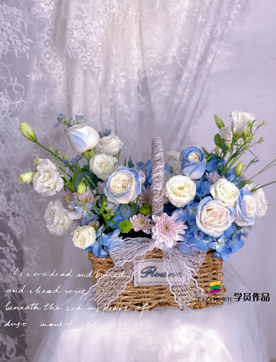 廣西花藝插花學(xué)校作品---韓式手提花籃:說(shuō)起韓式,顏色清新,簡(jiǎn)潔大氣是韓式的主要特征。而韓式手提花籃通常小巧精致、細(xì)膩?zhàn)匀?,注重?xì)節(jié)、富有小資情調(diào)。選擇的色系一般是清新淡雅類,偏向浪漫和優(yōu)雅,顯著的特點(diǎn)是干凈利落、手工精致,沒(méi)有太多的束縛和規(guī)矩。下面,就一起來(lái)看看廣西花藝培訓(xùn)專業(yè)學(xué)校(麗竹花藝學(xué)校)學(xué)員們的花藝作品吧!