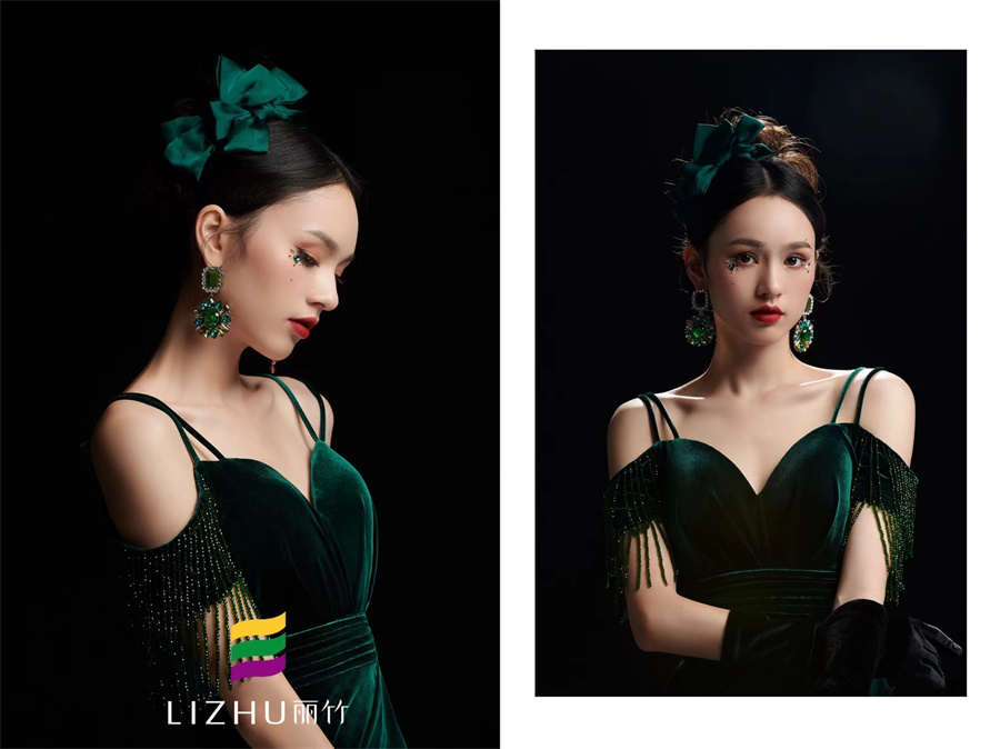 整體墨綠的色系搭配,打造嬌俏可人的妝容,配搭夸張墨綠鉆石耳飾以及綢制蝴蝶結(jié),與絨面吊帶珠子點(diǎn)綴的流蘇禮服相互碰撞,繾綣詩(shī)意,復(fù)古迷人。