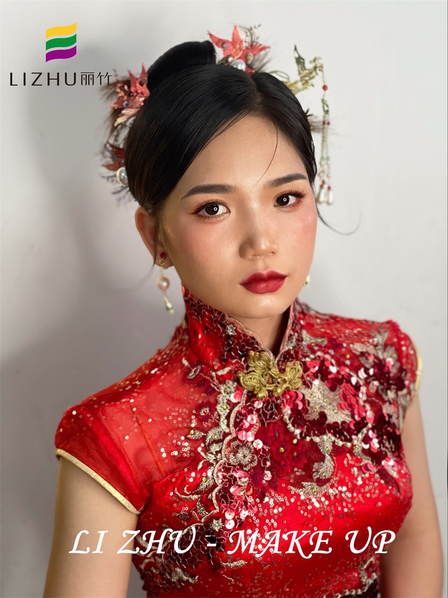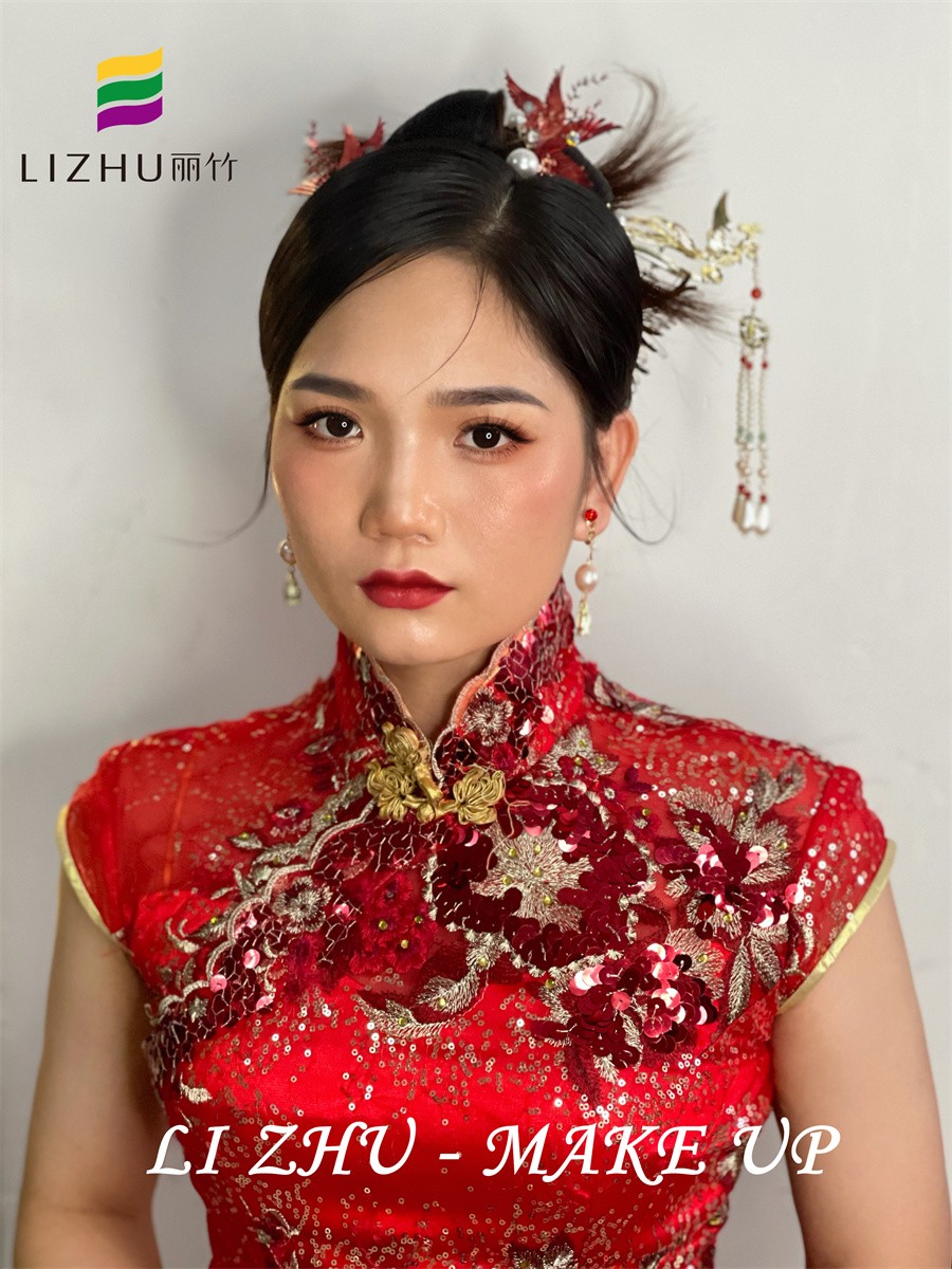 南寧新娘妝培訓(xùn)學(xué)校、南寧新娘妝教得好的培訓(xùn)、南寧新娘妝培訓(xùn)班作品---新娘敬酒造型:簡(jiǎn)潔大方的高發(fā)髻盤發(fā),耳邊靈動(dòng)的抽絲碎發(fā),輪廓感極強(qiáng)的絹花發(fā)飾,配搭大氣優(yōu)雅的珍珠耳飾,與紅色亮片刺繡相互呼應(yīng),更能襯托新娘貴氣喜慶的氣質(zhì)。如果你也想在南寧學(xué)新娘妝,或是想知道南寧學(xué)新娘妝的學(xué)校有哪些?歡迎到麗竹學(xué)校參觀試聽(tīng)。