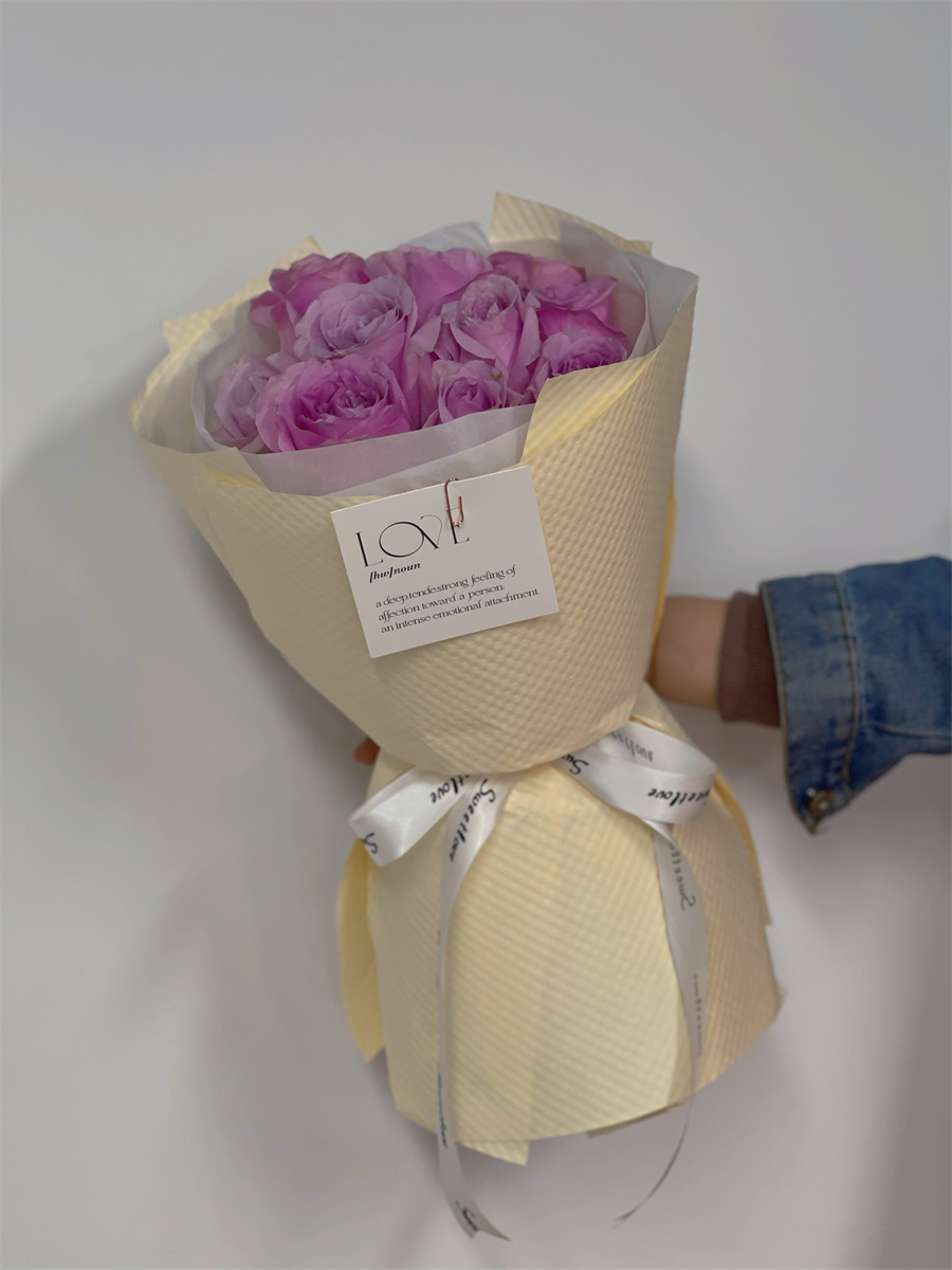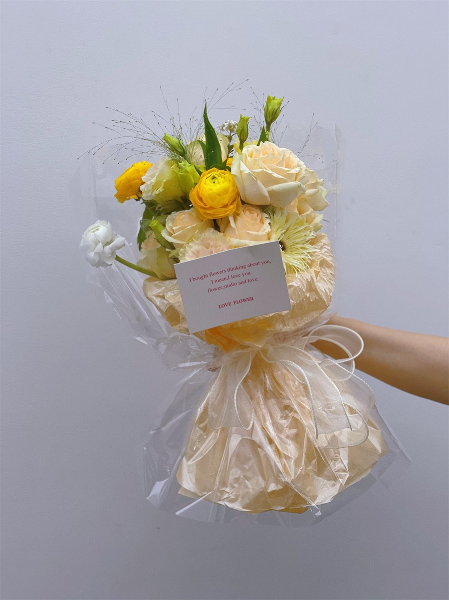 在進(jìn)行圓形花束的制作時(shí),在確定主花后,便可以按照螺旋的方式一次添加花材,使得整束花看起來飽滿之后,稍作調(diào)整成為一個(gè)圓形的輪廓,然后便可以用繩子在根部綁好進(jìn)行修剪。花材處理好了之后,將包裝紙裁剪出適當(dāng)?shù)拇笮。缓蟾鶕?jù)花的形狀包裹起來,用彩帶幫緊并打成一個(gè)蝴蝶結(jié),這樣圓形小花束就完成了。