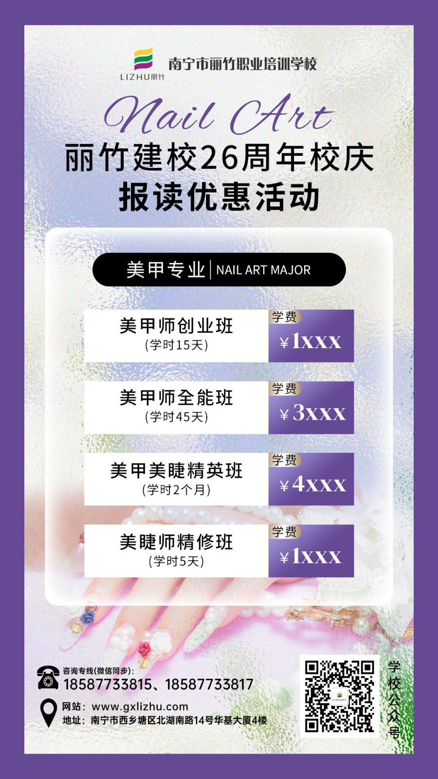 法式美甲只是眾多美甲款式中的一種,如果你想在廣西學(xué)美甲培訓(xùn),想知道廣西美甲學(xué)校多少學(xué)費?想知道廣西學(xué)美甲要多久?如果你有這些疑問,那么趕緊關(guān)注麗竹學(xué)校-美甲師造型班,讓我們的招生老師為你進(jìn)行解答吧!