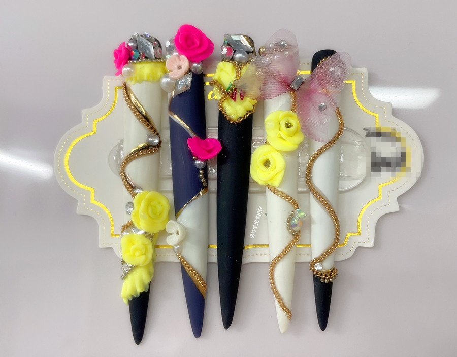 美甲師們在特別定制的長甲片上,通過采用彩繪,粘貼飾品,雕花,暈染等手法繪制出各種不同風格的圖案。圖案的款式可以根據(jù)個人喜好而定,可以是彩繪水墨畫,輕奢復(fù)古的堆鉆款,也可以是充滿二次元的漫畫款……只要你喜歡,天馬行空任你畫。
