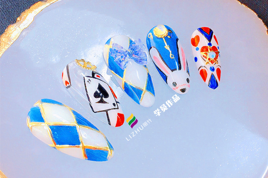 南寧美甲進(jìn)修、零基礎(chǔ)美甲學(xué)習(xí)作品---歡樂馬戲團(tuán):整副作品采用藍(lán)色和與白色相互搭配,用彩繪的畫法進(jìn)行描繪,栩栩如生的撲克與兔子圖案,更顯趣味,營造出了一副青春洋溢的氛圍感。在南寧學(xué)美甲,為什么選南寧美甲學(xué)校-麗竹學(xué)校?是因?yàn)樵谀蠈幟兰着嘤?xùn)取得成功的美甲技能人口相傳的好口碑,是全國賽事獲獎(jiǎng)無數(shù)的專業(yè)認(rèn)定!