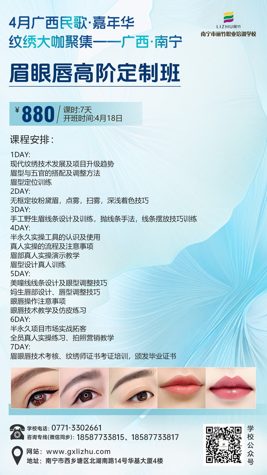 南寧紋繡學校排名、南寧紋繡開班信息:4月18日上午,南寧紋繡學校-南寧紋繡眉眼唇進修班《紋繡全 能大師班》正式開班啦!朱斌老師作為此次課程的主講導師,在麗竹學校上了一節(jié)精彩紛呈的宣講課,并針對此次課程可以學到的成果進行了概述。