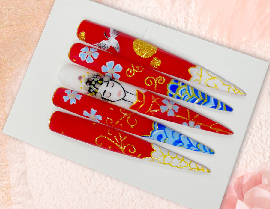 美甲技法:作品使用彩繪的方式進行圖案描繪。色彩選擇大紅色作為主色,金色作為輔助色,外加藍色作為點綴,讓作品從視覺上更有層次感。而繪制的中式新娘圖案,在漫天花朵下微閉雙眼靜靜等待儀式開始,更有金邊勾勒的出的金碧輝煌,仿佛一場富貴吉祥的中式婚禮躍于眼前。