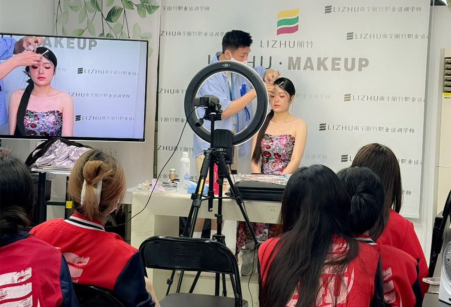 廣西化妝彩妝學(xué)校推薦、廣西化妝課堂:隨著國(guó)風(fēng)的興起,國(guó)風(fēng)元素也被廣泛運(yùn)用到了彩妝時(shí)尚行業(yè)領(lǐng)域中。隨著國(guó)風(fēng)潮流越來(lái)越人關(guān)注,“新中式”也成為了很多婚禮新人的選擇。下面,廣西彩妝進(jìn)修班(麗竹彩妝進(jìn)修班)就通過(guò)真人實(shí)操示范,為同學(xué)們講解新中式禮服新娘造型特點(diǎn)。