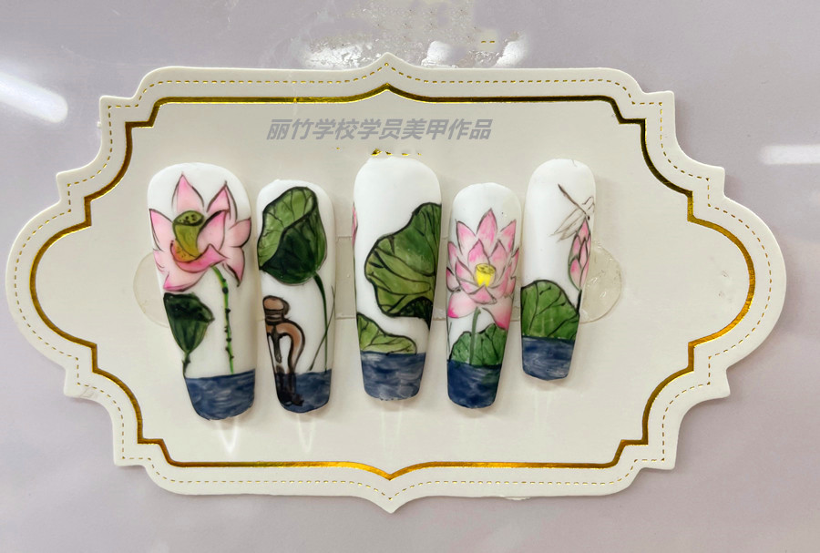 廣西美甲真人實操---手繪荷花美甲