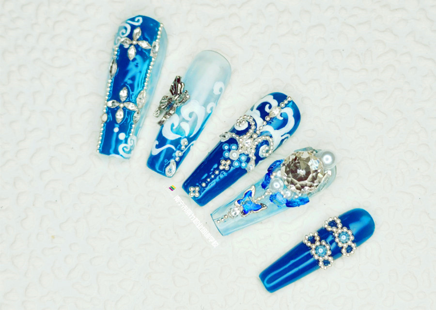 克萊因藍(lán)貼鉆美甲,南寧美甲造型專業(yè)學(xué)校實訓(xùn)作品
