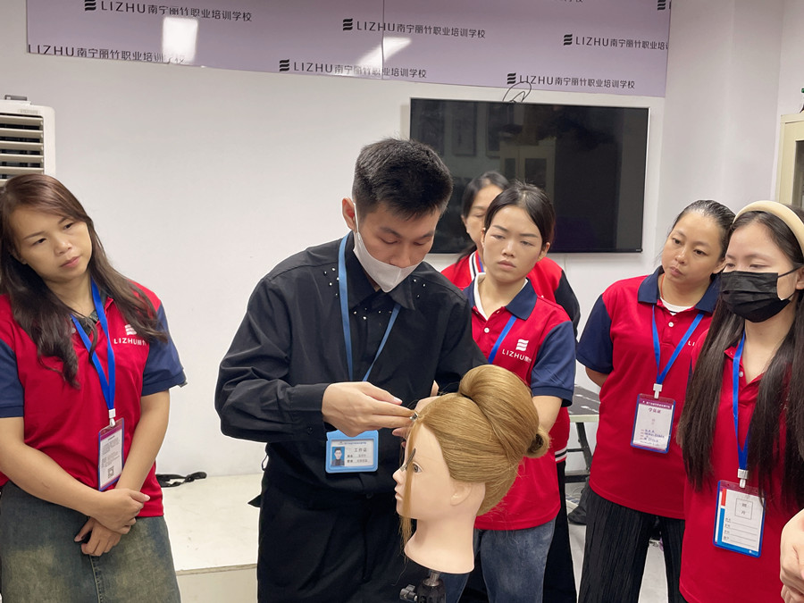 南寧化妝編發(fā)、南寧學(xué)盤發(fā):南寧化妝發(fā)型學(xué)校(麗竹化妝發(fā)型學(xué)校)就為大家演示下南寧專業(yè)化妝發(fā)型課程里關(guān)于赫本頭發(fā)型手法技巧的內(nèi)容。然后在采用倒梳的方法將頭發(fā)打成蓬松的狀態(tài),用手調(diào)整發(fā)型團狀,并利用固定發(fā)夾將團狀秀發(fā)牢牢固定在頭頂。之后用在將團狀的發(fā)髻往兩邊撥弄成扇形展開,梳理四周頭發(fā)到服帖,用發(fā)膠固定好形狀即好。