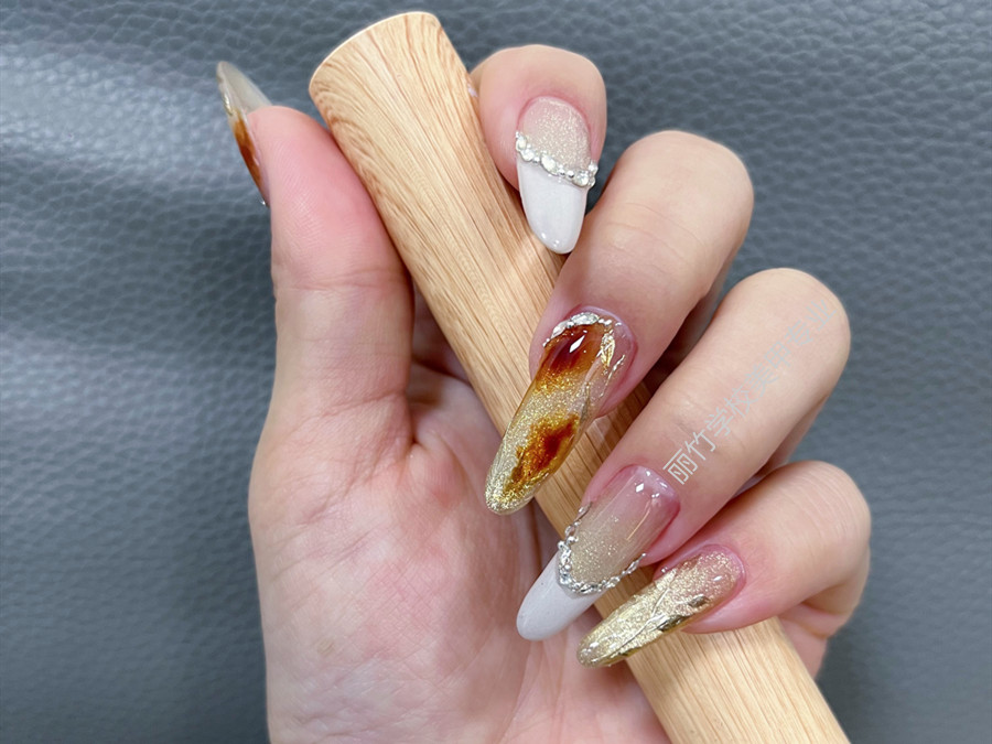 廣西美甲訓練、廣西美甲職業(yè)教育:作品主要以貓眼膠作為主題繪制。以棕色暈染起到點睛之筆的作用,然后在指尖勾畫出法式風格的微笑弧線,然后用白色彩繪膠進行填充,之后在粘貼碎鉆進行裝飾,使得整副美甲作品變得更加高雅和精致。