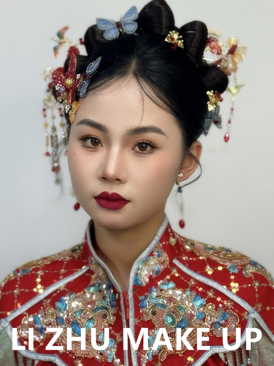 廣西學新娘妝、廣西新娘妝跟妝:明艷動人的底妝,亮眼的紅唇描繪彰顯氣場,中式卷筒發(fā)髻,配上寓意喜慶和美好的珠釵花朵蝴蝶發(fā)飾,穿上采用傳統(tǒng)紅色作為主色調(diào)之余,配以不同色系的亮片鑲嵌在衣服上,肩膀使用披肩設計點綴,使得整個造型更加精致和吸睛。