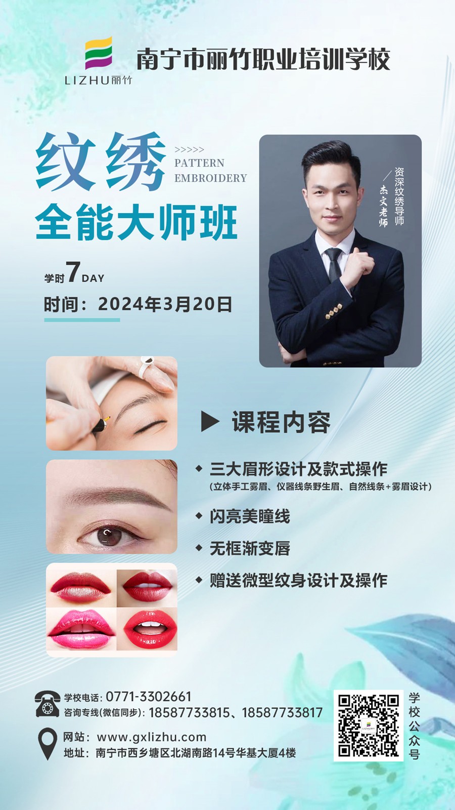 廣西紋繡、廣西紋繡進(jìn)修:廣西南寧紋繡職業(yè)學(xué)校將在3月20日進(jìn)行廣西眉眼唇培訓(xùn)班(麗竹紋繡大師班)培訓(xùn)課程。行業(yè)紋繡導(dǎo)師(杰文老師)手把手,一對(duì)一全程指導(dǎo),學(xué)習(xí)席位備受歡迎,如果不想錯(cuò)過(guò)此次課程,趕緊聯(lián)系我們報(bào)名吧!