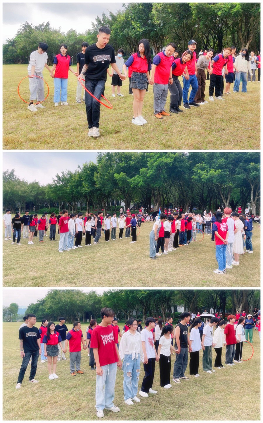 同學(xué)們手拉手圍成一圈,相互拉著的手不能放開,也不能用手指去勾呼啦圈,用呼啦圈穿過所有人的身體回到原位,用時快的隊(duì)伍獲勝??粗鴪錾贤瑢W(xué)們奮勇拼搏,場外的同學(xué)高聲吶喊加油,氣氛熱烈,彰顯出同學(xué)們的熱情與青春活力。