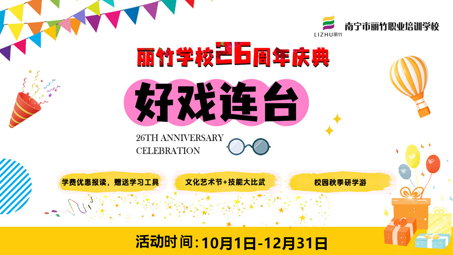 為了讓大家可以歡慶這個(gè)值得紀(jì)念的時(shí)刻,除了之前進(jìn)行的麗竹學(xué)校建校26周年慶典系列活動(dòng)“報(bào)讀優(yōu)惠活動(dòng)”,麗竹學(xué)校還特推出了即將在11月7日-8日舉行“麗竹學(xué)校校園文化節(jié)”和“麗竹學(xué)校校園技能大賽”,吃喝玩樂(lè)學(xué),邀請(qǐng)共奏青春協(xié)奏曲!